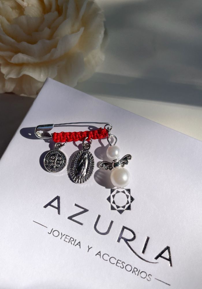 Pin de protección para embarazada, color plateado con dijes religiosos.